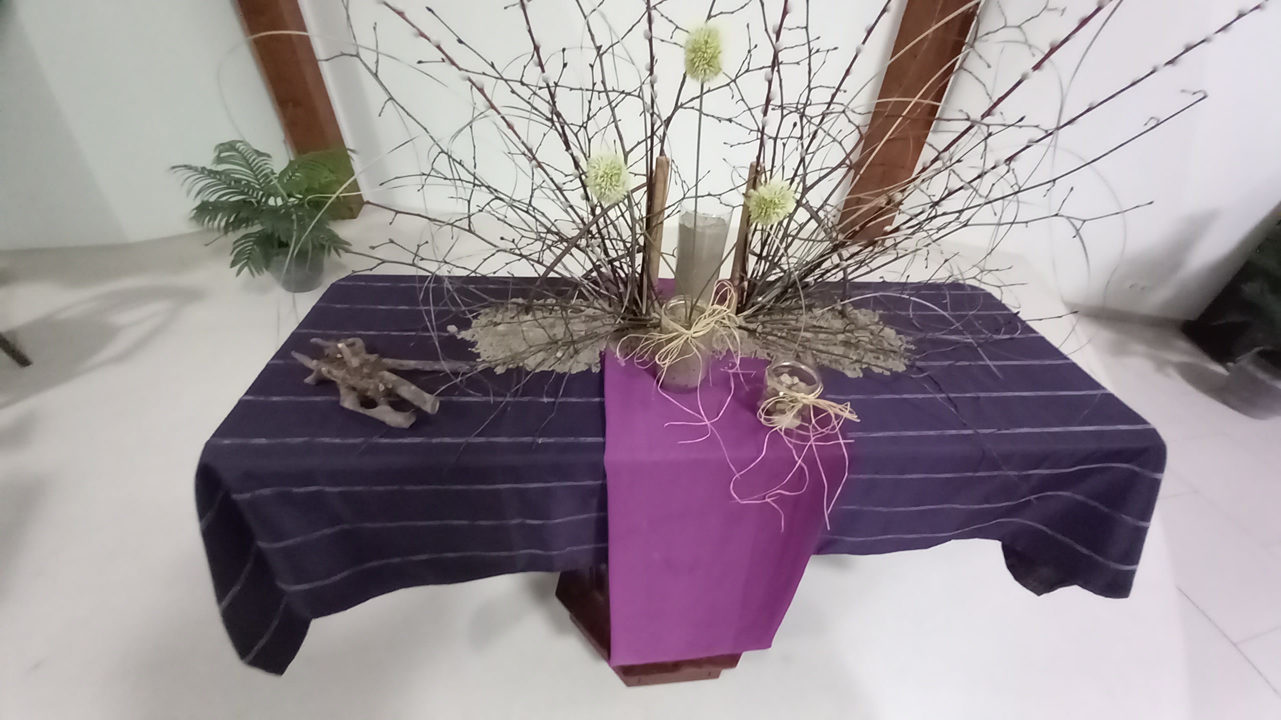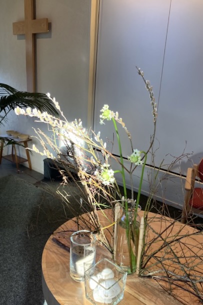 ![]() Liturgische schikking 2e zondag 40-dagentijd in de Verbinding in Midwolda Uitleg schikking (Gemaakt door Janneke Engelage) ![]() in De Ontmoeting in Scheemda (Gemaakt door Katrien en Ludolf Niemeijer) 2e zondag Veertigdagentijd. Zand en stenen benadrukken de berg. De drie bloemen staan symbool voor drie vrienden die zorgen, meedragen met de vriend op diens onbekende weg, in vertrouwen groeien. | ||