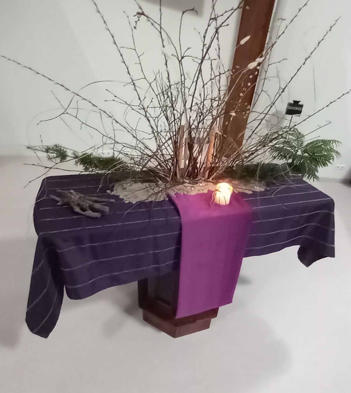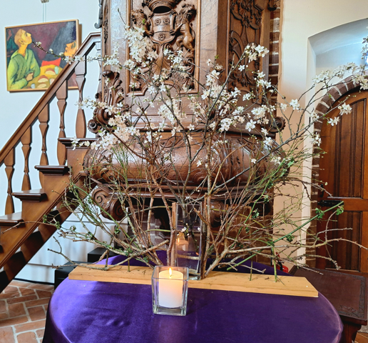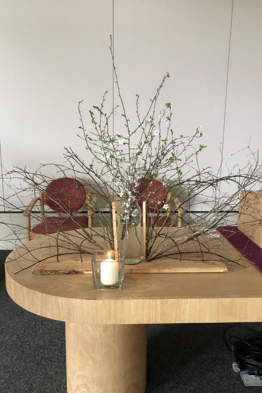 ![]() Liturgische schikking 4e zondag 40-dagentijd in de Verbinding in Midwolda Uitleg schikking (Gemaakt door Janneke Engelage) ![]() in de Marktpleinkerk in Winschoten Uitleg schikking (Gemaakt door Janny Geertsema-Kieft) ![]() Scheemda De Ontmoeting (Gemaakt door Katrien en Ludolf Niemeijer) Het zichtbaar maken van het werk van God kan met een bloemschikking met daar in wat bloesem. Veel bloesems zijn familie van de roos, een vijftallige bloem. Het getal 5 is het getal van de mens, de mens met zijn 5 zintuigen. Met die zintuigen kunnen we de ander zien, horen en voelen. Het kleine lichtje is een teken van de wereld. | ||