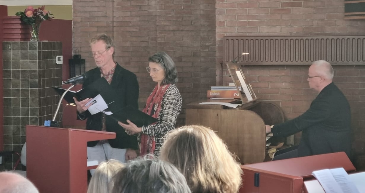een prachtig liturgisch stuk gemaakt door Zwanie Akkerman en Lineke Hut ![]() met uitleg van Lineke ![]() ![]() zang met gemeente, cantorij De Dollert en solozang van Aart de Goojer met Carien Huijzer onder begeleiding van organist Ulbe Tjallingii ![]() na het aansteken van een 25 jaar oude kaars door Gert Wybe leest Aart de woorden uit Marcus 6: 17 ![]() "Geven jullie hen te eten" een opdracht