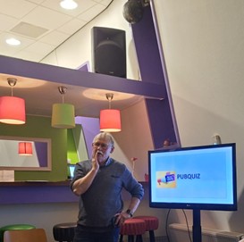 Onder het genot van een kopje koffie of thee voorzien van een door Ria zelfgebakken lekkernij kwamen de gesprekken met de aanwezigen los. Je zou denken dat zoals in de meeste cafés gebruikelijk is dat er een aantal mensen aan de bar zaten en her en der groepjes. Maar nee kerkcafé is anders, niemand aan de bar maar allen aan de tafel zodat er met eenieder gesprekken gevoerd kon worden. Om onze gedachten even te prikkelen was door onze eigen Sybrand Niessen (Geert Rademaker) een pub quiz samengesteld. Volgens Geert waren het geen moeilijke vragen. Maar als je de vraag krijgt van wat is een “earrebarre” dan denk ik is dit nu een makkelijke vraag? Nou degene die de Friese taal machtig zijn weten dus dat dit “ooievaar” betekend. Een kerkcafé waarin je ook nog iets kunt opsteken. Tussen de rondes in was er ruimte genoeg om met elkaar in gesprek te gaan en een drankje te nuttigen en van de lekkere hapjes te genieten. Ria en Anneke bedankt voor het organiseren. ![]() | ||