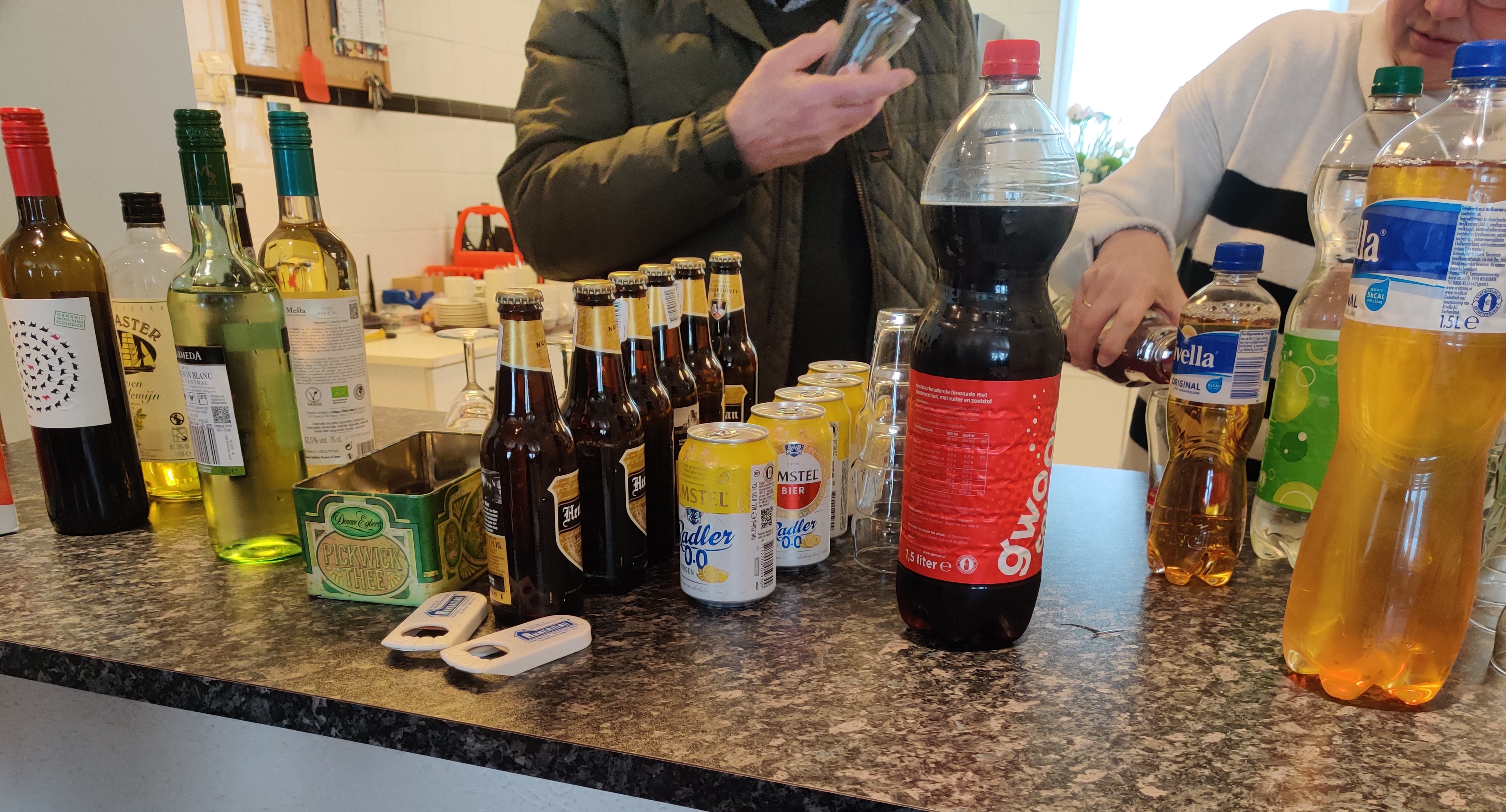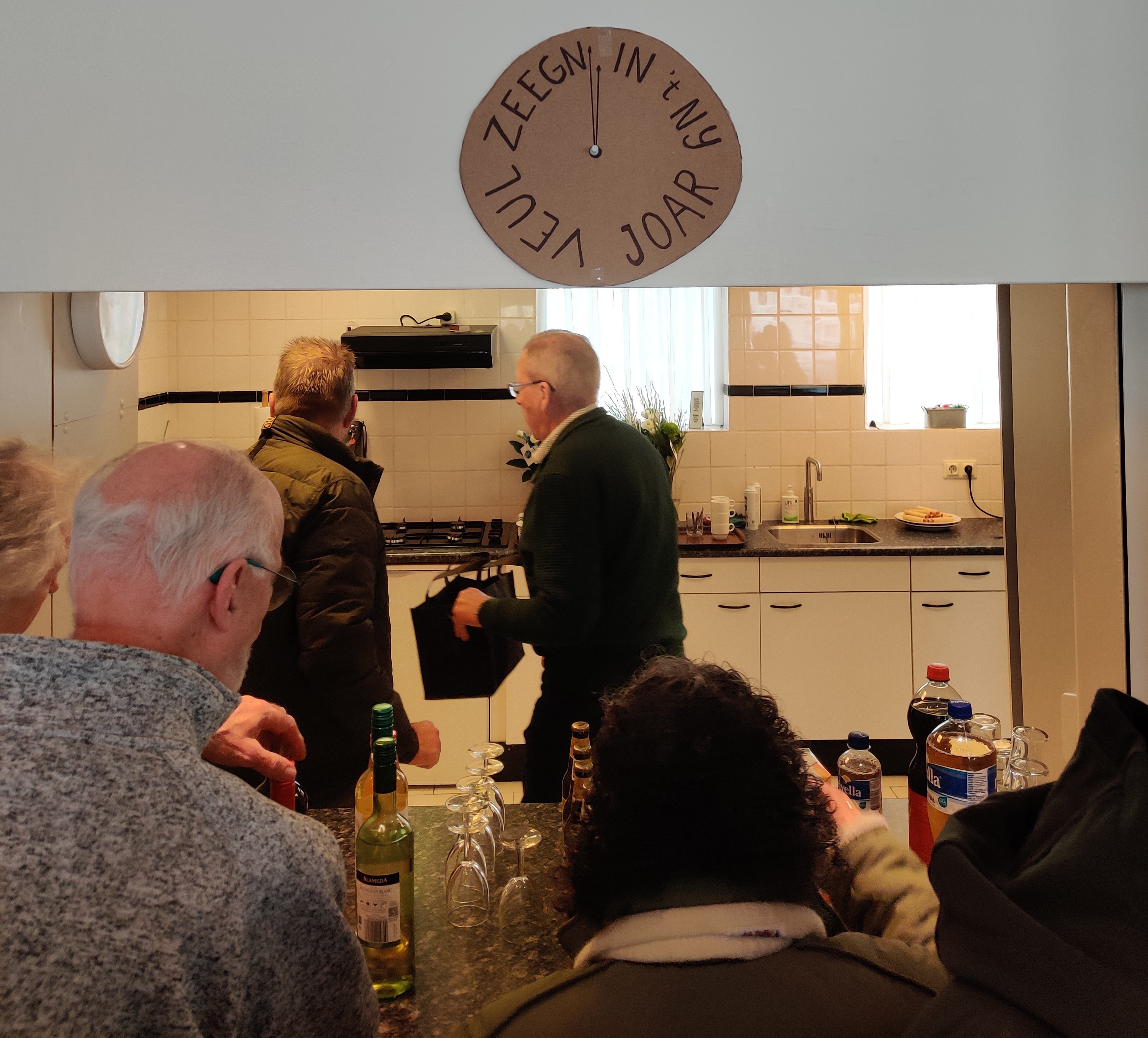 En daarna was het tijd voor de (in De Dollert) traditionele nieuwjaarsborrel. Verschillende mensen hadden weer drankjes en hapjes meegenomen. Wat te kiezen? Er was voor ieder wat wils en de hapjesschalen waren dan ook al snel leeg.
