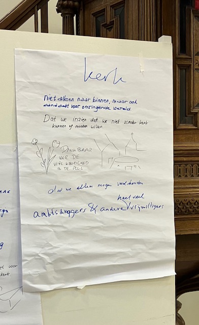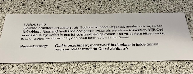 Een bijzondere dienst waarin niet alleen de pastores ‘het werk’ deden, maar waarin iedereen kon deelnemen aan een aantal verschillende activiteiten, zoals: het instuderen van een lied onder leiding van de cantorij, het per tweetal nader bespreken van de Johanneslezing, met iemand anders in gesprek gaan over een bepaalde afbeelding, een creatieve opdracht m.b.t. het thema, of het nadenken over gebedsintenties. Al deze activiteiten werden geïntegreerd in de dienst.