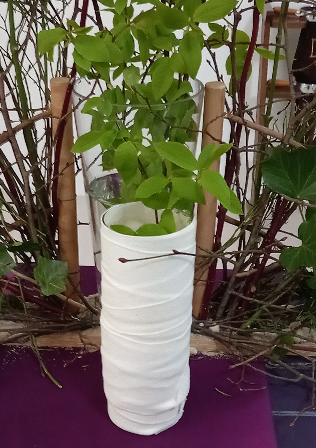 ![]() Liturgische schikking Stille Zaterdag in de Goldhoornkerk in Oostwold Uitleg schikking (Gemaakt door Zwanie Akkerman) ![]() in De Ontmoeting in Scheemda (Gemaakt door Katrien en Ludolf Niemeijer) Enkele takken staan voor de zorg voor het lichaam. De doek is een verwijzing naar de balseming en het neerleggen in het graf. Door de doek is het leven niet meer zichtbaar. ![]() ![]() in de Marktpleinkerk in Winschoten Uitleg schikking (Gemaakt door Janny Geertsema-Kieft) | ||